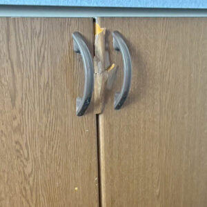 施工後に既存の取っ手を取り付け直し、扉の開閉に支障がないかを確認。全体を見渡し、色合いや仕上がりをチェックして完成です。