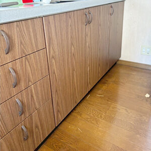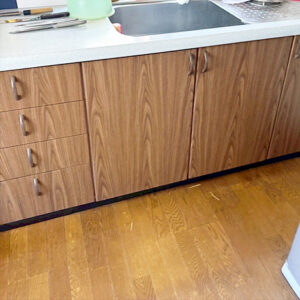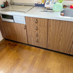 床の色とも自然に馴染み、統一感のある仕上がりとなりました。部分的な工事でありながら、キッチン全体の印象が大きく変わるのがダイノックシート施工の魅力です。