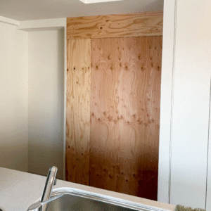 パテで下地を整え、クロスを貼ってからカップボードを設置します。